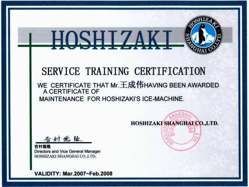 Maintenace certification of Hoshizaki ice cube maker