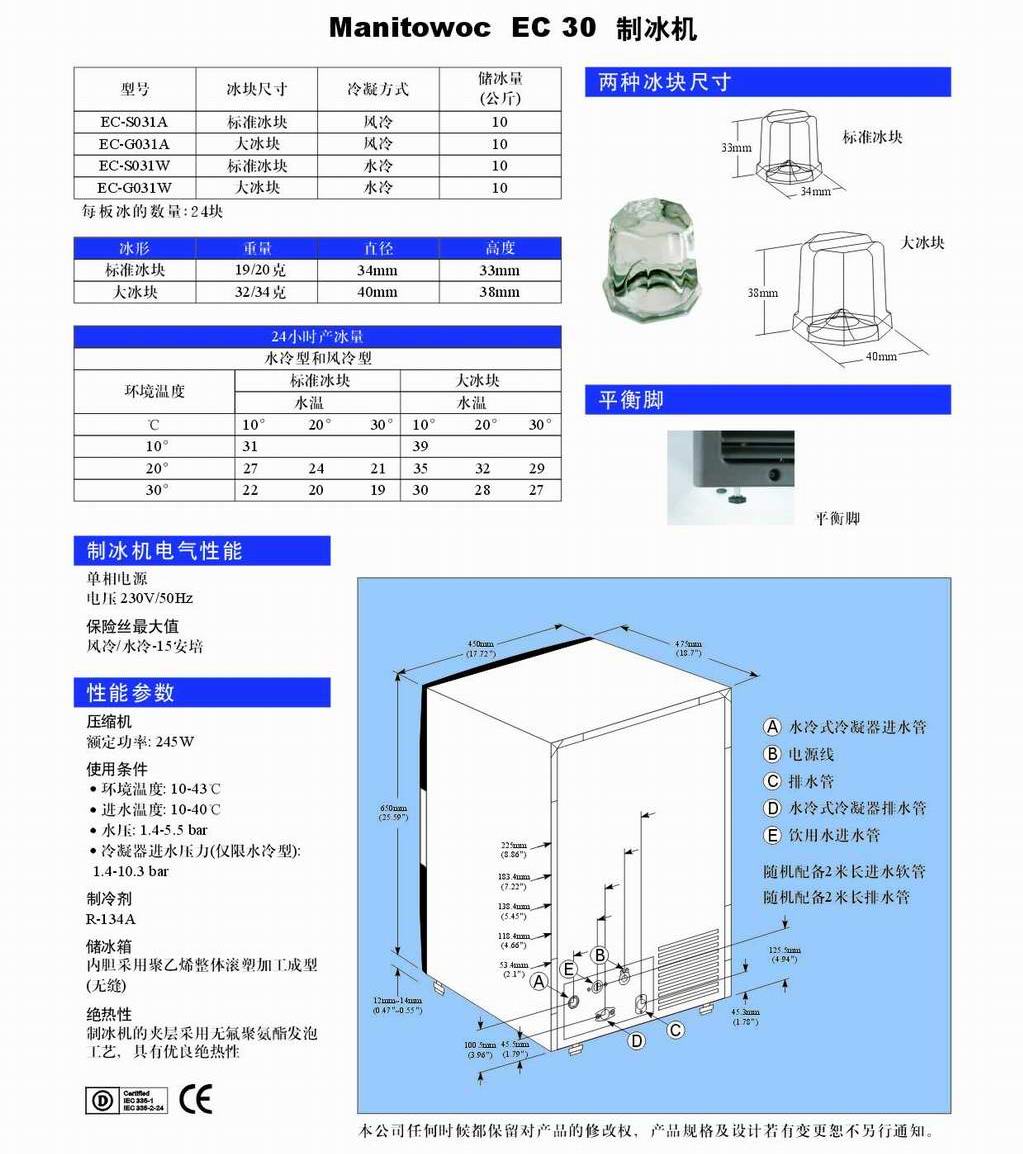 | 注:上述制冰的工况条件--环境温度为21°c时,进水温度为10°c; |